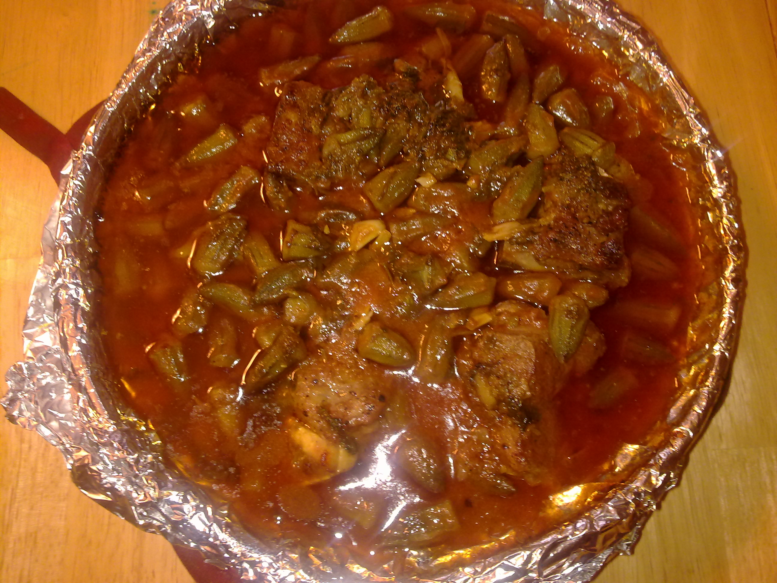 After an hour and a half, take the okra, place in a pot and add the rest of the olive oil. Fry for about 3 minutes under medium to high heat. Add onto the meat and sauce, cover and place back in the oven for another half an hour. Place a frying pan under medium heat and add the rest of the olive oil, cilantro and chilly powder. Fry for a couple of minutes and sprinkle on top of the dish and serve hot with either rice or bread.