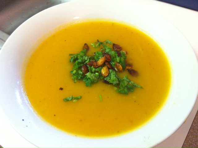 spoon the soup into bowls and garnish with chopped cilantro and roasted seeds. Goes well with garlic bread.