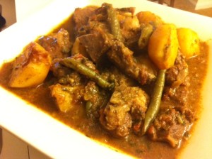 I used a pressure cooker to cut on cooking time, but you can use a regular pot of course. Add the oil to the cooker/pot and let them saute. Add the garlic and let that cook, but make sure it does not burn. Then add the meat and let it cook for a little. Then add the rest of the ingredients except for the potatoes and let cook for about 5 minutes. Then add the potatoes and cook for 3 minutes, and then add a cup of water and close the pressure cooker, or cover if you are using a regular pot. Cook under medium low heat until meat is tender. Serve hot with bread.