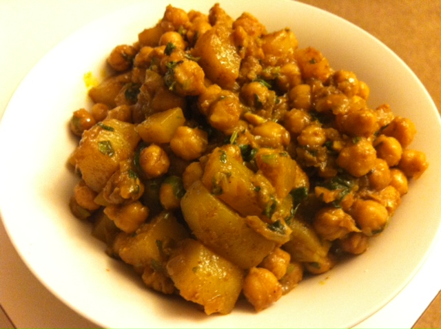 At medium heat and using a frying pan [with a lid] add the onions and garlic and sautee until the onion is browned. Add the ginger and tamarind [again optional] and all of the spices [you can add about a quarter cup of water to the spices before you put them in]. Or you can add the spices to the mixture and then add water. This is so it does not burn. Now when the water has evaporated and only the oil and spices are left, add the potatoes and salt and add a little more water [1/4 cup] and cover and let cook under low heat. Once the potatoes are almost cooked through, add the chick peas and cover and cook until they brown. Turn off heat, garnish with the cilantro and enjoy.