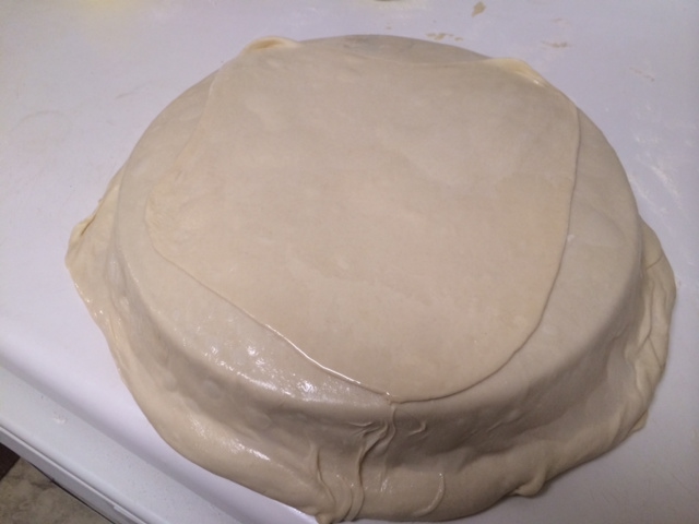 Now you are done and ready to place in the oven. Open up the oven and carefully take the tray that has been heating up inside and carefully flip the layers onto the hot tray. Do this carefully, using your fingers to help the dough along. Close the oven and let it cook. It will puff up beautifully like this: