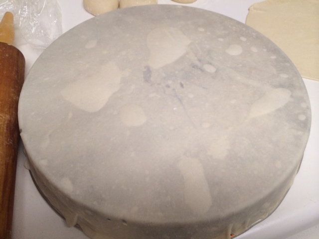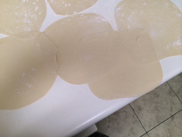 Then with a rolling pin starting opening each one into thin circles, and leave them aside. Make sure you flour the counter so they don’t stick to it or to each other.