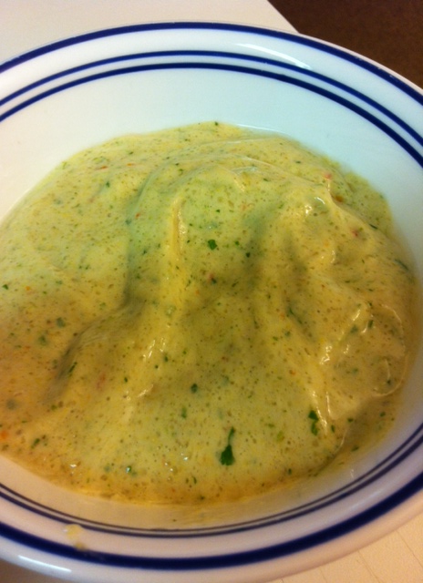 Alright first soak the ground fenugreek in water–about 1 cup. Mix, cover and leave aside for 2 hours. The water will float to the surface and the fenugreek will form a paste at the bottom. Pour out the water–away goes the bitterness of the fenugreek with it. Now take it and freeze it for about 5 minutes– we do not want it to freeze but rather get cold. Take it out and using a whisk briskly [or you can use an electric whisk] and it will become nice and frothy. Add the lemon juice and the salt and whisk some more and it will become even more frothier. Leave aside.