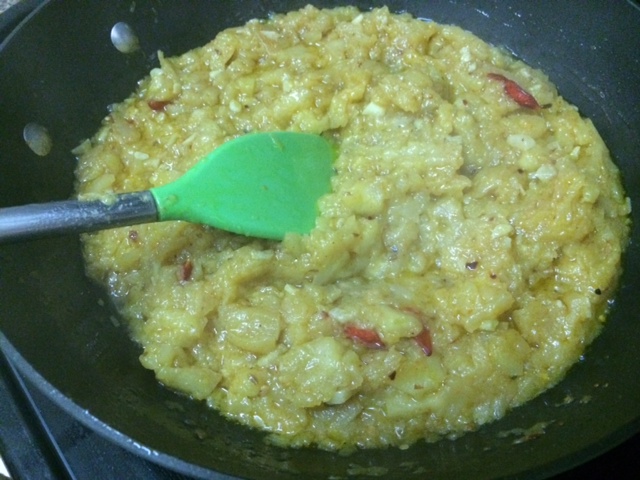 Cover and leave on low heat and let soften. About 6-8 minutes. Then uncover and add sugar and salt and taste. Then leave on stove under low heat until all the water has evaporated and only the oil oozes out of the mixture when you make a hold in the middle with a spatula. The consistency should be smooth, a little mushy with small chunks.