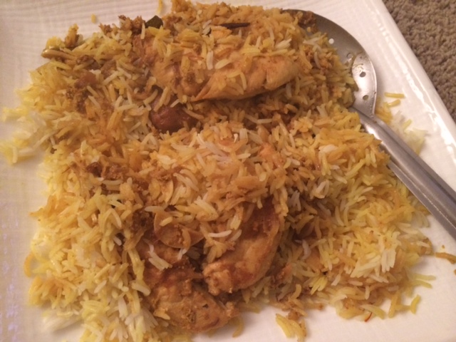Alright let’s begin! In the pot, under medium high heat, add the onion slices and let brown a little. Then add the oil and potatoes. When the onion has browned, add the meat, garlic, spice, tomatoes, green chilly, and cilantro. Let cook for 5 minutes and then add 1 cup of water and let cook until the potato is almost done [but not quite]. Layer all the rice on top. Sprinkle a little of the food coloring and about 2 tbslp of water and place in oven for 20-30 minutes at 350 degrees Fahrenheit. It’s done. Serve hot with your favorite salad.