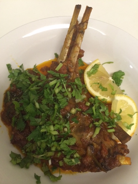 Alright, let’s start! Preheat oven to 400 degrees fahrenheit. I first took a frying pan and added the olive oil and under medium high heat i took the lamb chops and browned them on each side. I took them out and placed the onions and sautéed them. Then I added the tomatoes and let them cook for about 3 minutes. Then all the spices –cumin, coriander, turmeric, black pepper, cayenne pepper, and salt. Let that cook for about 2 minutes, then add the tomato paste and add a cup of water. I prefer to add boiling hot water that I keep in a kettle on the side while I am cooking. After about 3 minutes add the lamb chops , add more water to cover them completely (if your frying pan is not deep enough then transfer to an oven dish), cover with foil and place in the oven. Once you hear it bubbling lower the temperature to 350 and let bake for an hour to an hour and a half. Run a knife through the chops to make sure that they are tender. If tender then they are done. The sauce should be nice and thick, but not dry. Place on a serving platter, garnish with cilantro and lemon slices and serve with toasted french bread. Enjoy!