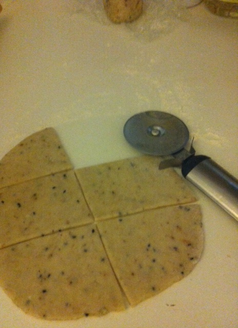 When the oil is ready , roll out the dough with a rolling pin. It should neither be too thin or too thick. Here’s a pic of the dough rolled out and cut with a pizza cutter:
