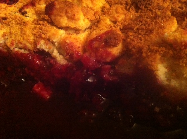Alright now to assemble–you will need one more ingredient : 4 crushed Graham Crackers . In a pyrex dish pour the fruit, then take the dough and form a rough crust on the top–nothing fancy. Then add the crushed Graham crackers to finish off. Bake in a 400 Fahrenheit degree oven for 25 minutes. Serve warm with vanilla ice cream, or whipped cream. It also goes well with canned table cream. Enjoy.